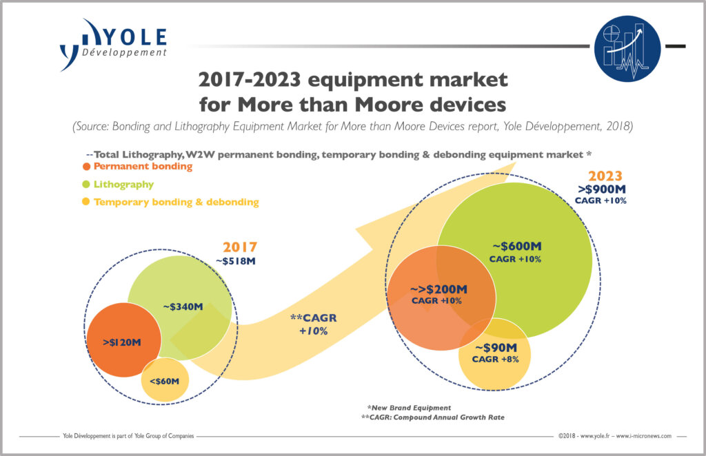 Yole Développement (Yole) releases this month its technology & market report dedicated to bonding and lithography equipment market for MtM devices. In its new edition, the market research and strategy consulting company proposes a comprehensive overview of the bonding and lithography equipment for MtM devices with an accurate update of the 2017-2023 equipment market forecasts. This report points out the technology trends across MtM devices and details the related technology roadmap. The 2018 edition reveals a valuable analysis based on competitive landscape as well as a detailed comparison between new and refurbished equipment by MtM device.