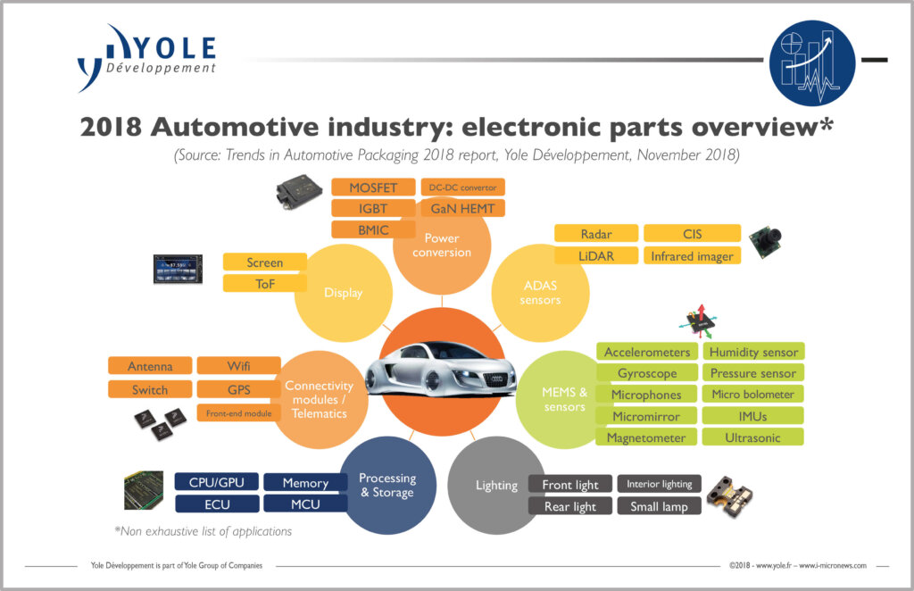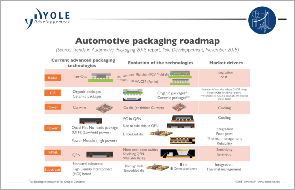 A detailed description of the automotive packaging report from Yole is available today on i-micronews.com, advanced packaging reports section. All the types of packages used in the automotive industry, in addition to technology roadmaps are well detailed in this technology & market analysis.