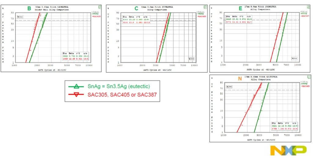 In general, they conclude that tin/silver solder shows better reliability than tin/silver/copper as shown on the Weibull plots shown below.