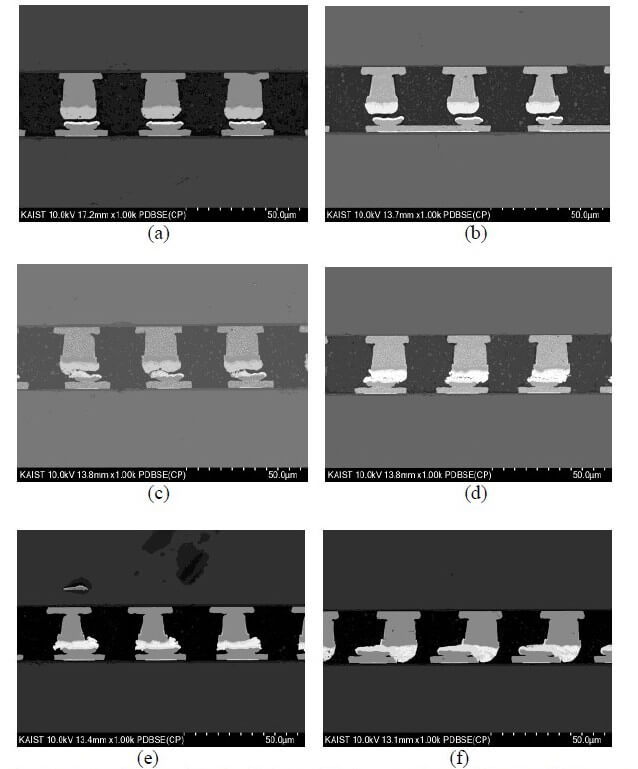 When the bonding force is applied, three force sensors precisely control the bonding pressure while piezo actuators measure the actual pressure in real time. The irradiated laser beam then passes through a transparent quartz tool at the bottom of the pressure module and reaches the die to be bonded. Laser time and power are used to control the solder reflow process. Solder joints formed at different power settings are compared to a TCB bond in the figure below. The temperature of the stages in the pre-bonder and post-bonder were 90°C. The laser power was varied from 80W to 180W. The bonding force was 70N.