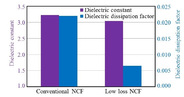 During a presentation at the recently held 69th ECTC, recently held in Las Vegas, Hitachi Chemical pointed out that the 5G era, just around the corner, will be achieving 10 Gbps or higher telecommunication speed. Such RF speeds will be enabled by NCF with lower loss dissipation factor (Df) values (Figure 1). The Df of a conventional epoxy-based NCF is 0.02 vs their newly developed NCF which is 0.006.