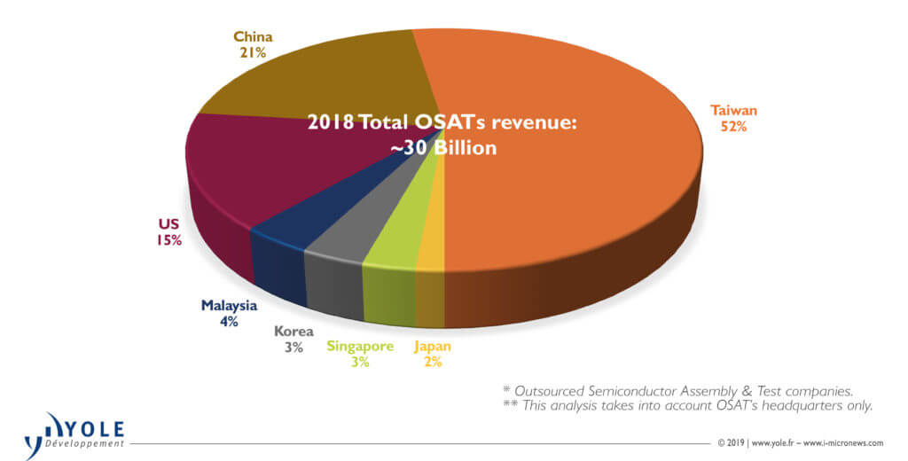 Clearly, the 2018 top OSATs sky-high revenue was segmented from the rest of the pack. This gap in market share is mainly due to the legacy in business and consolidations by merger and acquisition that has taken place in recent years.