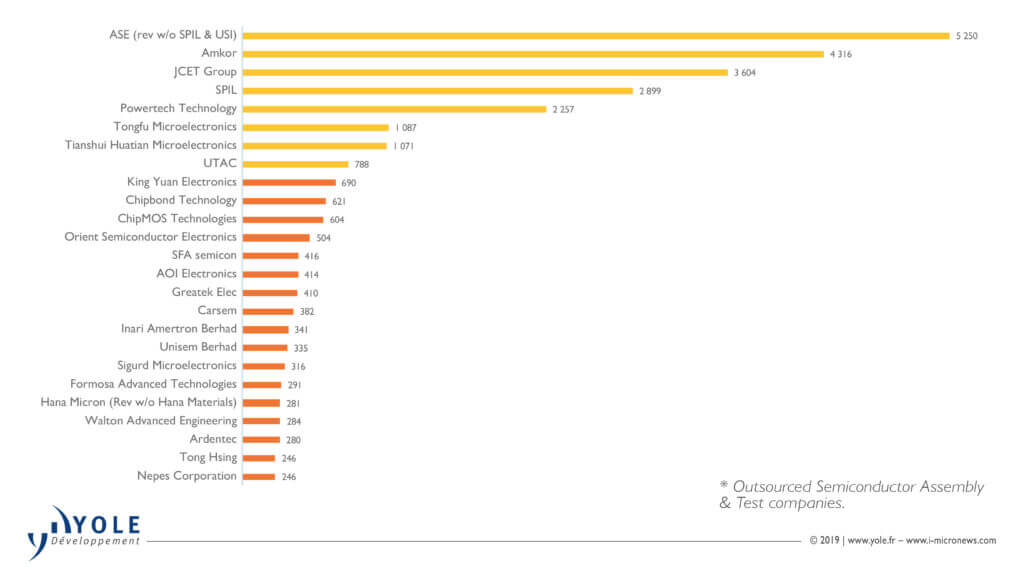 “On the other hand, if we only take into account the year-on-year (YoY) growth of each company, the analysis will be very different,” explains Favier Shoo, Technology & Market Analyst at Yole Développement (Yole). “Within the top five OSATs, ASE (without SPIL and USI), Amkor Technologies and JCET Group were all showing good growth between 2~3% YoY. SPIL grew strongly with a 5% YoY while PTI outperformed with an impressive growth of 15% YoY. This truly reflects the fierce rivalries amongst the OSAT leaders to strive for more business.”