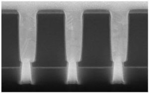 In practice, this backside processing can be done by first hooking the CMOS processed wafer onto a carrier using wafer-to-wafer bonding. Then, the wafer’s backside is thinned down with an extreme level of thinning – to about a few 100nm. This allows us to expose nm-scale through-Si vias that run from the wafer frontside to the backside and connect them with extremely fine granularity (Figure 4).