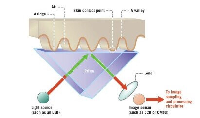 An optical fingerprint reader bounces light up to your finger and back down to the sensor, which interprets the reading as a 2D image. Essentially it takes a photograph of your finger to determine the pattern of ridges and valleys. This technique captures an optical image and detects patterns (ridges or unique marks) on the surface, by analyzing the light and dark regions of the image. Experts report that this approach is relatively easy to fool with a photo, a fingerprint transfer, or a prosthetic fingerprint.