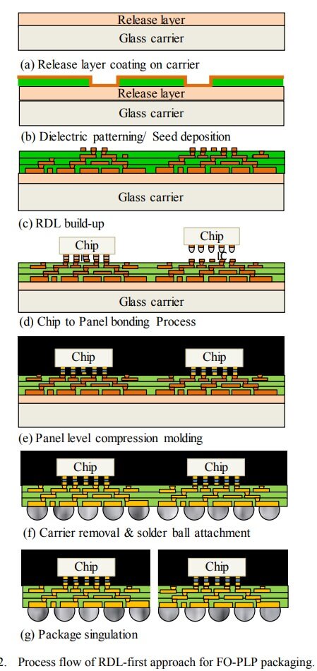 In this study, the package size is designed as 15mm × 15mm with embedding single chip with a size of 10mm sq. Packages are fully populated in Gen 3 panel with an array of 34 rows by 40 columns, so there is a total of 1360 packages in one panel. The figure below shows the IME / A Star process flow for FO-PLP packaging technology. A very thin laser release layer, used for the debonding process, is coated onto a glass panel carrier. Then, dielectric coating, lithographical patterning, seed layer deposition, photoresist coating, and development are conducted for preparing the RDL layer plating process. Two RDL layers are fabricated on a glass carrier panel by repeating the above processes. Then chips are bonded to panel with Cu pillar connections.