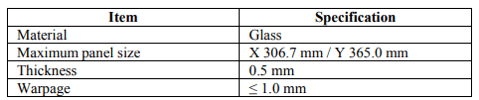 While maintaining 0.8 μm pattern fidelity across a large exposure area is a key requirement of fine RDL processes, Fanout (FO) technologists seek to transition from wafer-based to-panel based processes to improve productivity and costs. To support high-resolution FOPLP processes, Canon is studying a panel handling system for FPA-5520iV steppers. Although FPA-5520iV steppers cannot yet process 730 x 920 mm panels (Gen 4.5 ) they have developed a substrate handling system for R&D purpose which handles 365 x 306.7 mm panels ( 1/6 of a Gen 4.5 panel) providing 0.8 μm resolution. Details of the allowable substrate range for the FPA5520iV panel handling system are included in the table below.