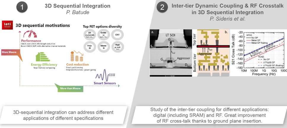 With advances in process technology, monolithic logic transistors are becoming closer to reality. Several of the papers CEA-Leti presented discussed depositing materials such as amorphous silicon, or a metal oxide, and then manufacturing a transistor. Perrine Batude, of CEA-Leti, presented during a tutorial on monolithic semiconductors and was also a co-author on several papers that demonstrated a wafer bonding technique where the next level channel is bonded to the previous transistor. Then the next transistor is manufactured on top. Batude believes that the toolbox for monolithic devices is ready and they will begin to emerge in the manufacturing fabs fairly soon. One of the advantages of monolithic technology is that you can place a higher mobility material on top of the base transistor, as was demonstrated by Intel using MOCVD GaN on top of a silicon PMOS using a layer transfer technique. Monolithic technology will create some interesting semiconductor opportunities in the not-too-distant future. First in the sensor area according to Batude, and then possibly in other microelectronic areas. Figure 1 demonstrates some of the possibilities for 3D sequential integration.