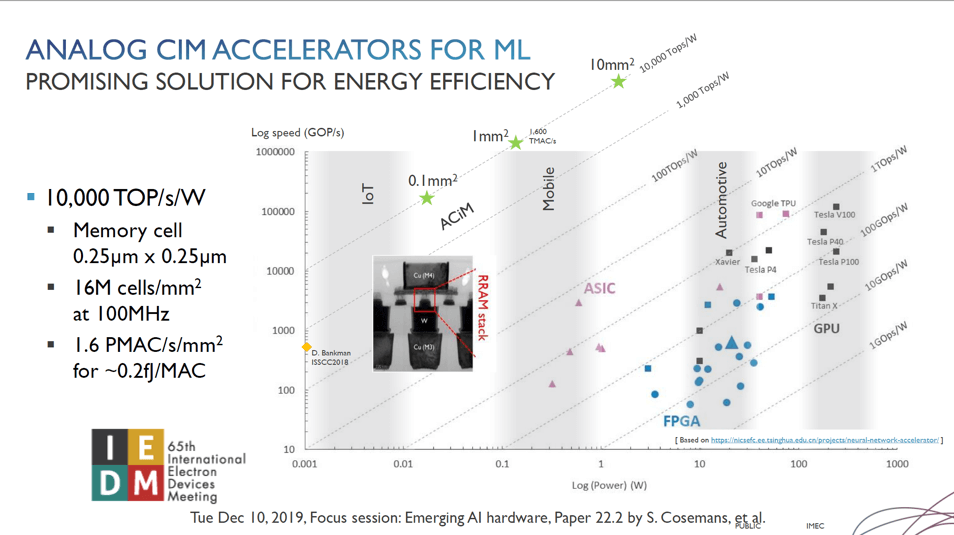 Diederik Verkest discussed how using analog compute in memory accelerators for machine learning can improve both speed and power (Figure 4). The work at IMEC has demonstrated a record efficiency 2700TOP/s/W, which is significantly lower power and higher speed than the current chip solutions available on the market. With the concerns over the power needed for ML, it will be interesting to see how quickly this research gets picked up by IMEC’s partners.