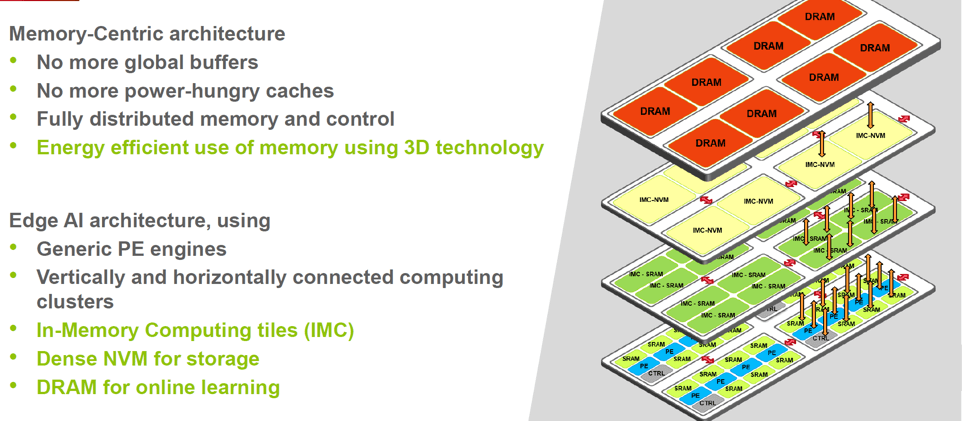 IMEC and Leti researchers then discussed some key areas of research. Alexandre Valentian explained how moving memory closer to the edge helps to reduce power consumption. This can be achieved by stacking and connecting both horizontally and vertical memory to bring critical memory closer to the compute to help reduce power consumption and latency.
