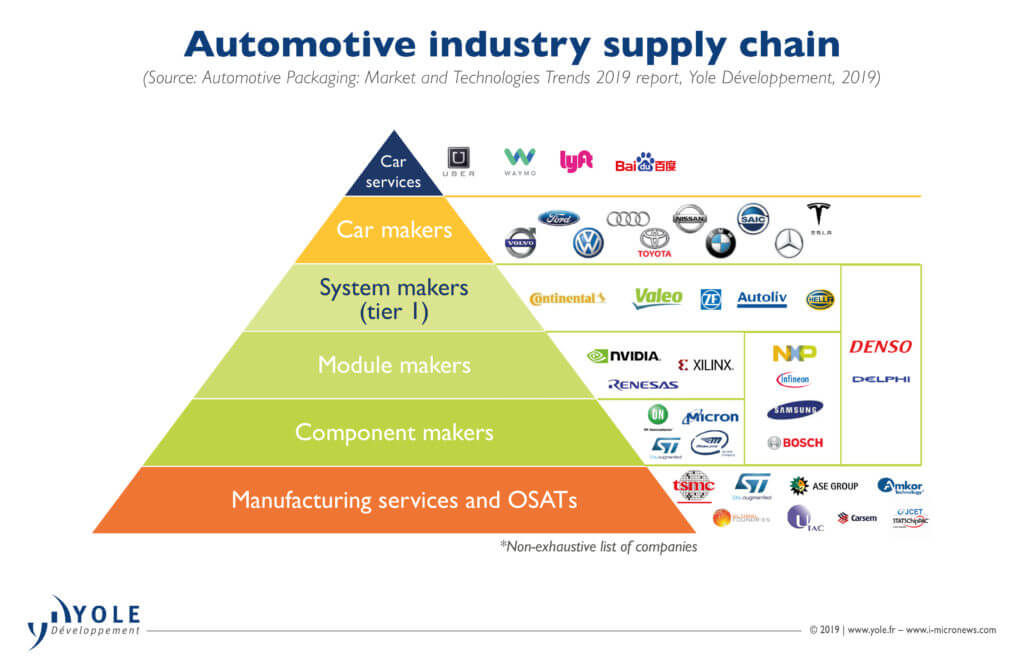 Besides car makers, if we descend the supply chain pyramid we find system makers that can also be module makers. Yole identified, for example, Denso and Delphi. Component and module makers, which include companies like Infineon Technologies, NXP, Robert Bosch, and others, are the next link in the supply chain, following companies offering manufacturing and packaging services: TSMC, Amkor, ASE, and UTAC.