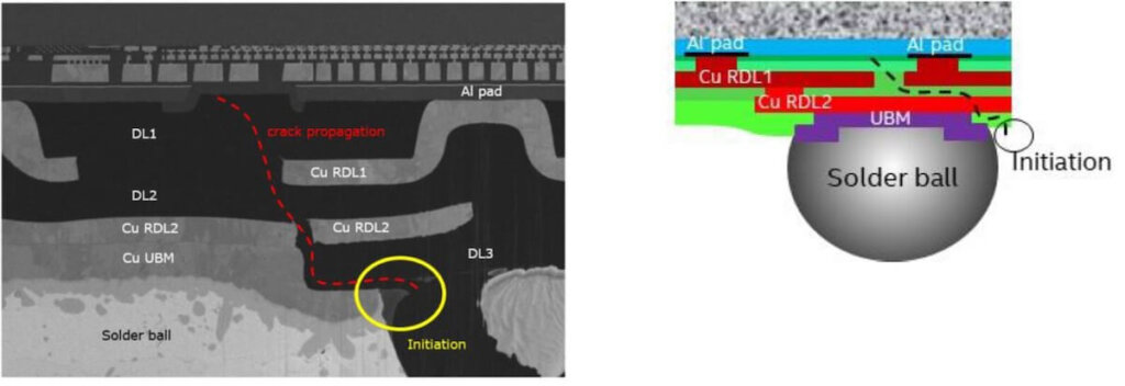 The third failure mode was a combination of Failure Mode 1 and Failure Mode 2. The crack propagated in some cases up to or in the BEOL area. The initiation points of the failure modes were at the corner of the solder ball and UBM interface.