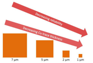 Miniaturization not only involves the decrease of trace width but also of trace thickness. As copper RDL traces get thinner they also get less reliable (Figure 4.)