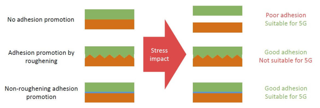 One also needs to have smooth Cu surfaces to avoid the skin effect in upcoming high-frequency 5G applications. This is in contrast to a common way of achieving good copper adhesion to polymer dielectrics, which is to intentionally roughen the copper surface in the way they roughen PCB copper surfaces. Atotech proposes that new adhesion promoters will have to be found to eliminate this issue. [IFTLE adds “or better dielectrics with better adhesion.”]