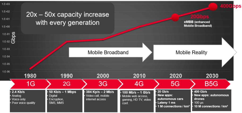 Beate Hoehne from Keysight in Germany, outlined decades of progress in wireless communication, comparing generations one to five in the slide below (Figure 2).