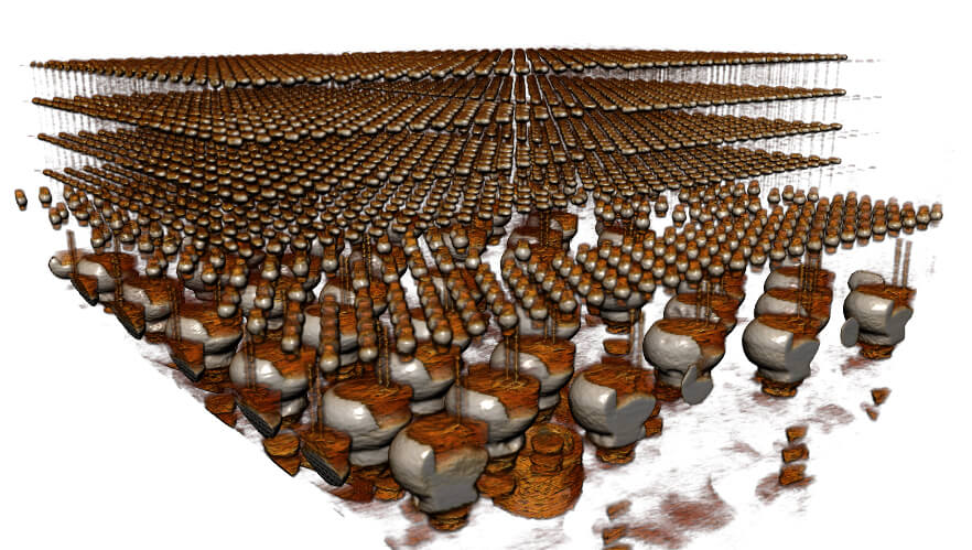 After encapsulation and C4 bumping, the pre-stacked 2.5D chip module is singulated and assembled to the organic substrate using mass reflow and then underfilled. Decoupling capacitors, stiffener rings, and heat spreaders might be assembled to the substrate at this time as well. At this point, the 2.5D package is complete and ready for electrical testing. Figure 5 shows a 3D rendering of the interconnects in the finished 2.5D package.