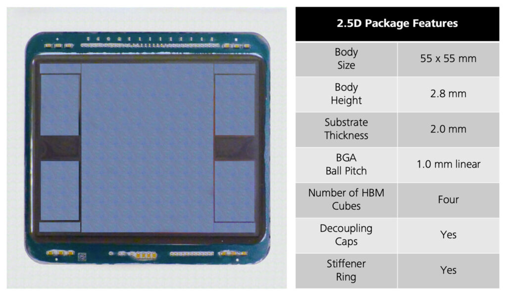 A typical 2.5D package consists of four high bandwidth memory (HBM) cubes and a central processing unit (CPU) mounted on a silicon interposer, which is in turn mounted on an organic substrate: