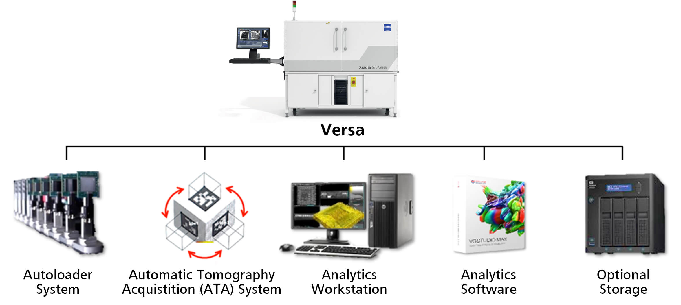 Digital cross-section technology is available from ZEISS with the RepScan® system, which is based on the company’s Versa 3D X-ray microscope with Resolution at a Distance™ and spatial resolution of 1 µm at 50 mm working distance, along with additional custom hardware and software as shown in Figure 1. The RepScan system can image and measure the following package features: