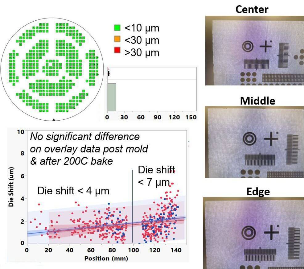 The team set up several experiments to evaluate different carrier systems, temporary adhesives, and mold materials. In partnership with Brewer Science Inc., a new temporary bonding material for room temperature die bonding was introduced, referred to as BrewerBOND® C1301. Both liquid and granular forms of advanced mold materials (referred to as M1 and M2) have been explored. The impact of these materials and processes on-die placement die shift and wafer geometry was investigated (Figure 3).