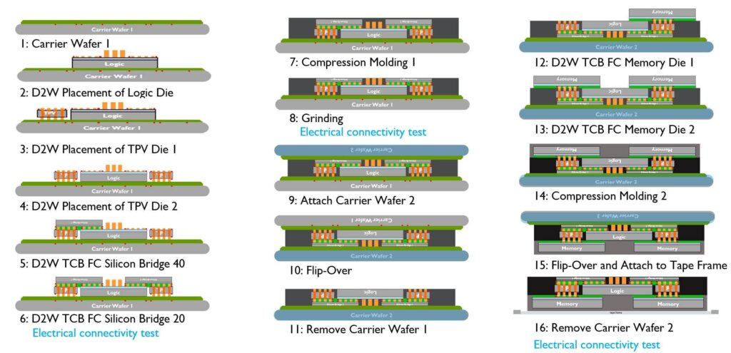 Die shift, wafer warpage, and bow can also be influenced by the mold material and wafer over-molding techniques. The assembly flow for the flip-chip on FOWLP involves two separate mold steps. A first over-molding step takes place after the silicon bridge is placed; a second after the memory die is flip-chip attached. It will be key to identify the right combination of temporary bonding and mold materials and processes to guarantee a low wafer distortion and die shift after molding.