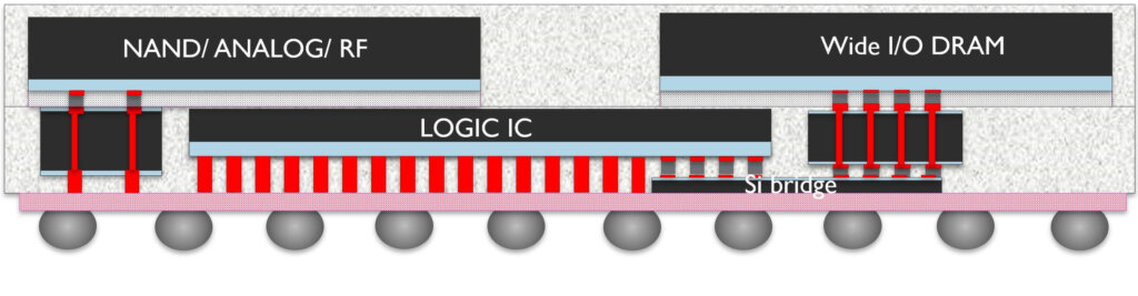 The imec team demonstrated the feasibility of this approach by using a test vehicle that is composed of seven individual (dummy) chip components: wide I/O DRAM, Flash memory, logic, two through-package vias, and two Si bridges. The interconnecting Si bridges and the through-package via chips are key components to realize the high-density connections. Through-package via chips are Si dies with through-Si vias (TSVs) and bumps of 40µm pitch. The Si bridges have bumps of 40µm and 20µm pitch. These components form a bridge between the functional dies (e.g. the logic and memory die), enabling ultrahigh chip-to-chip interconnect densities with a 20µm bump pitch.