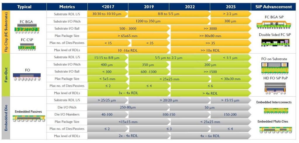 Similarly, their roadmap for system-in-package (SIP) technologies projects out to 2025 comparing ground rules for SOTA flip-chip ball grid array/chip-scale packages (FCBGA/CSP) vs fan-out (FO) packages vs embedded packages (Figure 2).