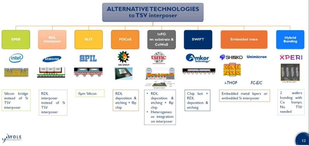 They also examined the technologies being developed based on non through silicon via (TSV) process flows to compete with silicon interposer TSV substrates (Figure 3)
