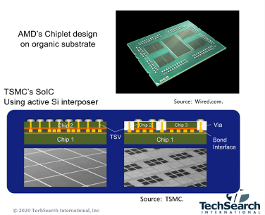 Vardaman also showed successful examples for multi-die integration, that reduce form factor and extend battery life. Apple’s iPhones and iWatches are leading examples of multi-die integration. Samsung’s smartphones also contain multi-die ICs. Intel’s Lakefield CPU, utilizing the multi-die “Foveros” technology, powers Samsung’s Galaxy Book 5 PC. MediaTek uses TSMC’s InFO oS technology to combine two large logic dice on a substrate. In addition to these recent examples for multi-die ICs, AMD, Broadcom, Nvidia, Qualcomm, Xilinx, and others benefit from their increased performance per Watt and have advanced packaging solutions in production.