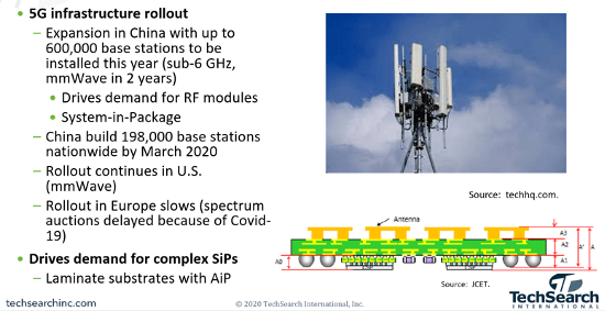 While unit sales of smartphones are likely to decline by 10% year-over-year (YoY) in 2020 (see Figure 2), the increasing complexity of smartphones (e.g. an iPhone 11 Pro Max contains 123 packages from 30 different suppliers) will continue to drive advanced packaging growth. In addition, pent-up demand in 2021 will lead to a projected 10% YoY unit growth. In addition, 5G functionality is further increasing IC content and the number of passives (primarily for filters) in smartphones.