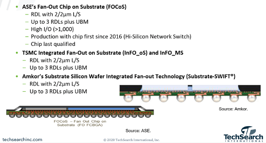 The most important trends in technological advancements are clearly the efforts of package vendors to reduce cost. Wafer/panel-level packaging, replacing silicon interposers with organic substrates and minimizing/eliminating costly TSVs are some of the major developments in progress towards reducing the cost of single and multi-die ICs. As examples, Vardaman showed several fan-out on substrate designs from major vendors (Figure 3).