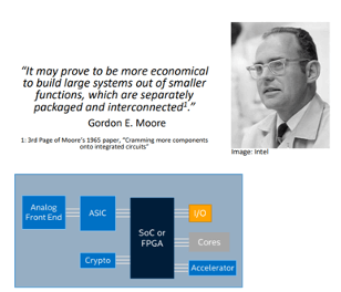 Krishna Settaluri from Blue Cheetah Analog Design, Inc., outlined how his company’s analog design tools, based on Berkeley’s BAG Framework, automate the generation of analog circuits, specifically designing physical layer I/O circuits (PHYs), compliant with Intel’s advanced interface bus (AIB). He developed the presentation together with David Kehlet from Intel and clearly showed that his team and Intel work together closely, to accelerate AIB market acceptance. To confirm the importance of chiplets, Settaluri showed a previously often overlooked statement from Gordon Moore (Figure 2) that predicted decades ago the need for these IC building blocks.