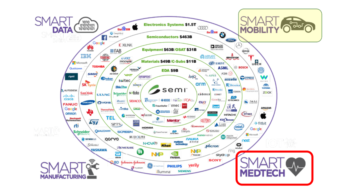 In addition to working on many important topics with more than 2200 member companies across the semiconductor supply chain, Smart Mobility (as covered here), Smart MedTech (covered below), Smart Manufacturing, and Smart Data, are SEMI’s current special focus areas.