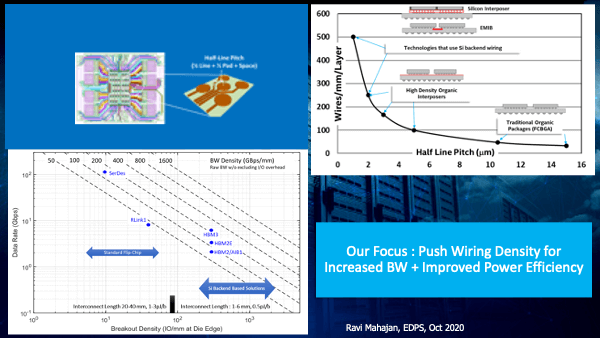 Ravi V. Mahajan is an Intel Fellow responsible for Assembly and Packaging Technology Pathfinding for future silicon nodes. He holds the original patents for silicon bridges that became the foundation for Intel’s Embedded Interconnect Bridge (EMIB) technology. In this presentation, Mahajan explained first the ongoing multi-die Heterogeneous Integration Roadmap (HIR) and why it replaced the single die SoC-centric ITRS efforts in 2017. Then he showed why the continuation of interconnect scaling in advanced packaging architectures is important. Tighter pitches between chiplets enable higher bandwidths and lower interconnect power dissipation – see Figure 2.
