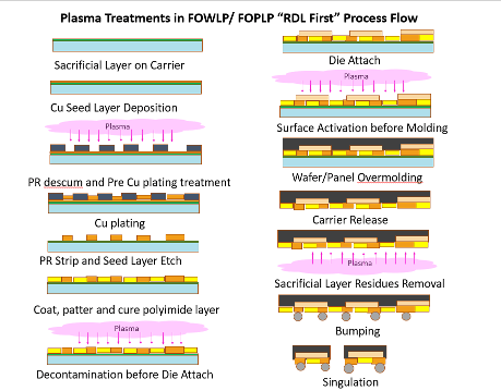 In recent years, there has been an increased focus on fan-out wafer-level packaging (FOWLP) due to the smaller packaging size requirements for smartphones and handheld electronic devices. FOWLP – and fan-out panel-level packaging (FOPLP) – is the process during which known good dies (KGD) from the original silicon wafer are selected and accurately attached to a wafer or panel-size substrate, over-molded with an epoxy compound, and then cured to create what is called a reconstituted wafer. Plasma treatment is needed to ensure that the surface is contamination-free, for surface treatment to aid the attachment process, and to remove photoresist or other organic residues.