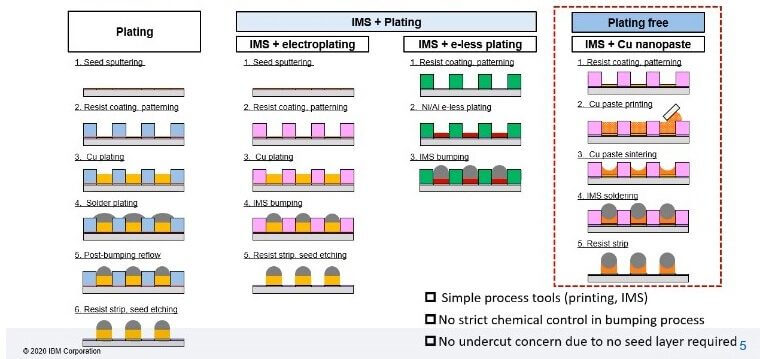Aoki of IBM Japan reported on the development of a plating-free copper pillar bump process by combining their injection molded solder (IMS) solder deposition process with their copper nano paste printing technology. If this process can be commercialized it would eliminate the need for seed layer deposition and seed layer etch operations. The injection-molded solder process is shown in Figure 1.