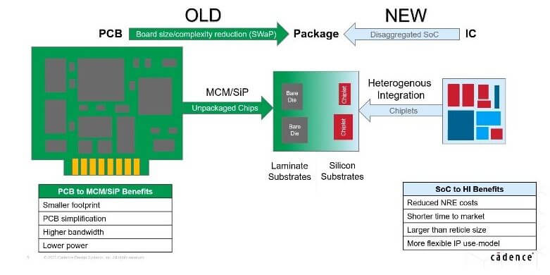 Figure 5 shows how mounting everything directly on the PCB was supplanted by MCM (later called SiPs) where chips were combined into modules. We are now seeing SoC’s broken down (IFTLE calls it disintegration) into chiplets and recombined into modules. Nice perspective and a nice explanation for those who are struggling to understand the difference.