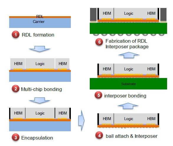 An RDL interposer package is fabricated using wafer-level manufacturing processes using the existing fab equipment. One can form the very fine pitch RDL patterns that are required for high-density interconnections between logic and HBM. In addition, Samsung contends that RDL has better design flexibility in terms of line width/space/thickness and dielectric thickness and via size. There are also various dielectric material candidates in the market, which provide options to achieve the best electrical characteristics. It is also beneficial for mechanical properties since CTE and modulus can be matched between RDL and substrate and, as a result, the package level thermal stress can be minimized for better package reliability. The process flow for their package is shown in Figure 7.