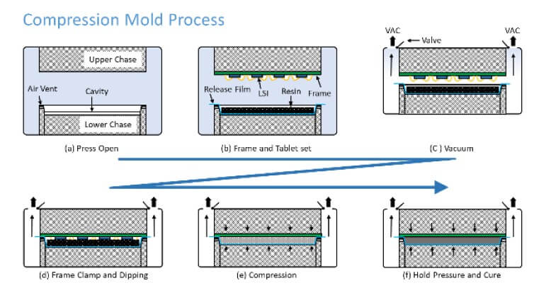 As in conventional transfer molding, the compression mold is composed of a preheated upper and a lower section. The granular or liquid resin is fed into the lower mold. To avoid air pockets vacuum technology is used to purge the air, which makes it possible to mold without voids. After this vacuum process, the resin is sealed by the immersion of the object set in the upper mold into the lower mold.