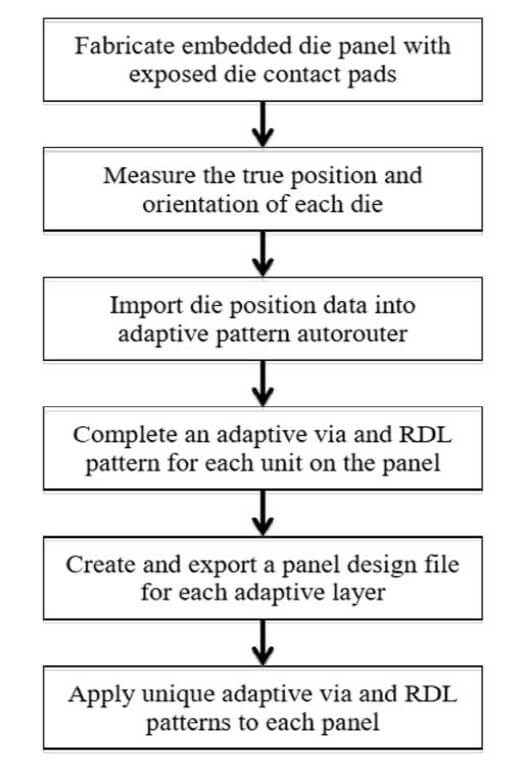 PLP of FOWLP suffers from die shift during the molding process. Adaptive patterning recompensates package design in real-time to compensate for die shift. The process sequence is shown in Figure 3.
