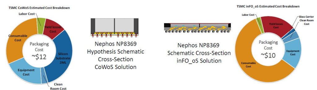 An interesting comparison was made between the projected cost of TSMC’s CoWoS vs InFO advanced packaging solutions (Figure 3). Am I the only one shocked that CoWoS would be only 20% more costly to package the same two-chip package (Nephos 8369)? We are not saying that is incorrect, mind you, just saying that this number appears closer than we would have thought.