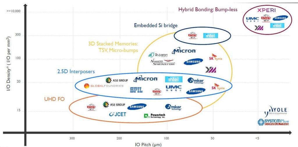 Figure 2 is interesting in that it breaks out the main players in various high-density advanced packaging categories. I guess I would question what the term “players” means to Yole. IFTLE still only sees 2 commercial “players” in advanced memory Hynix and Samsung …IFTLE is awaiting HBM product commercialization from Micron. We’d also question the number of sources of 2.5D silicon interposers. I don’t think Hynix or Micron were ever selling interposers. You’re more likely to get silicon interposers from Skorpios or Micross than from Hynix or Micron. Not that they couldn’t do it if they wanted to, but that they are not currently in that business.