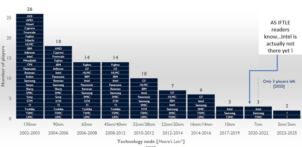 They started out by updating the following slide that has been around for at least a decade (originally from IHS I think) showing how logic companies manufacturing at the latest node have dwindled over time. As I have noted on the slide, actually when it comes to 7nm we know that Intel is NOT there yet.