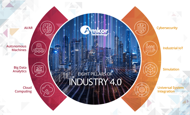 Amkor aligns to an eight-pillar structure to ensure success in Industry 4.0. Five of the pillars are foundational, while three enable an intelligent factory framework. The foundational technology pillars are: