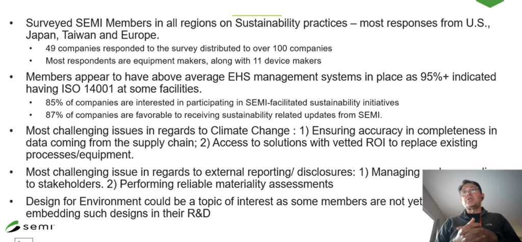 Oliver Corvez of SEMI kicked off the presentations with a review of SEMI’s EHS programs and their direction in sustainability (Figure 2). It is interesting to note that less than 50% of the companies responded, and of those only 85% were interested in participating in SEMI facilitated sustainability efforts. From a world where it seems like most are focused on sustainability, it seems like a low number.