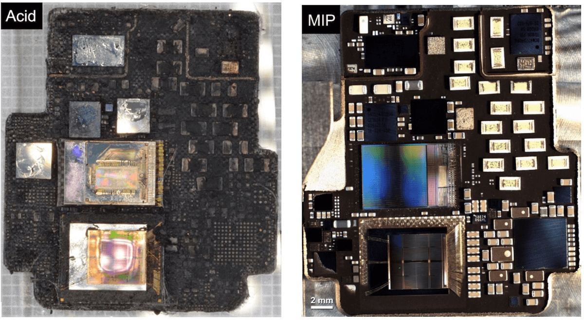 Conventional acid decapsulation can easily damage the top layer die and bond wires due to overexposure to acid, while the middle and bottom layer structures remain unexposed. It is also quite challenging to preserve the package perimeter to perform further electrical tests in specific test sockets when using acid decapsulation. The feature photo above compares a 26mmx29mm SiP module after acid decapsulation (left) and after MIP decapsulation. The image labeled ‘Acid indicates the over-etching and corrosion damage induced by acid decapsulation of a system-in-package (SiP) module.