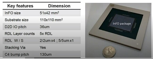 Terry Chang discussed integrated fan-out on substrate (InFOoS) technology for advanced chiplet integration. InFOoS is an InFO-based technology for the integration of chiplets for 5G network applications. It offers 2/2µm L/S and micro bumps on 40µm pitch on up to 1.5X reticle size. InFOoS has been in production since 2018. Hen compared it to a more standard multi-chip module (MCM) technology with 15µm L/S (Figure 4). It reveals 7X better bandwidth/mm.