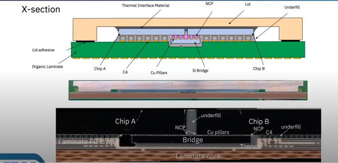 As can be seen in Figure 1, there is a direct copper pillar connection between chip A and chip B through a silicon bridge. That subassembly is joined to a laminate chip carrier with a standard C4 pitch.