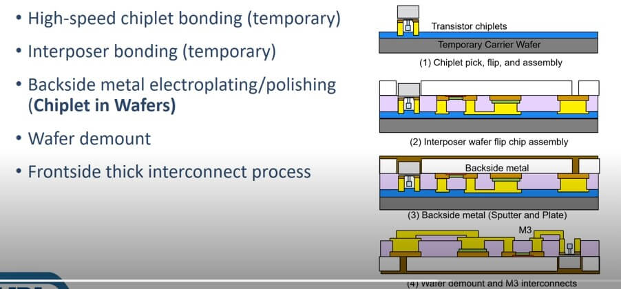 Chiplet assembly is shown in Figure 8. The chiplet is placed on a temporary carrier; the interposer is bonded; connections ae made and the temporary substrate is removed.