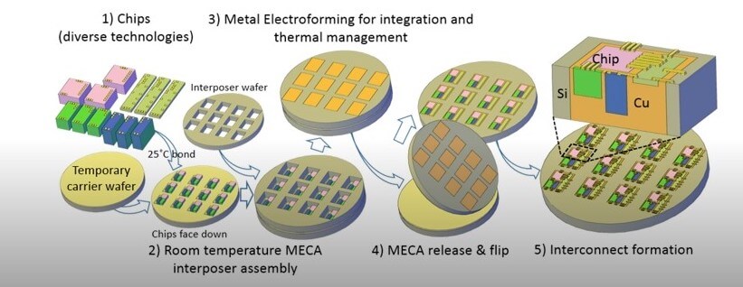 For MECA, chips are embedded in a metallic heat spreader (copper) as shown in Figure 6. Basically, a reconstructed wafer with the chips embedded in copper instead of a mold compound.
