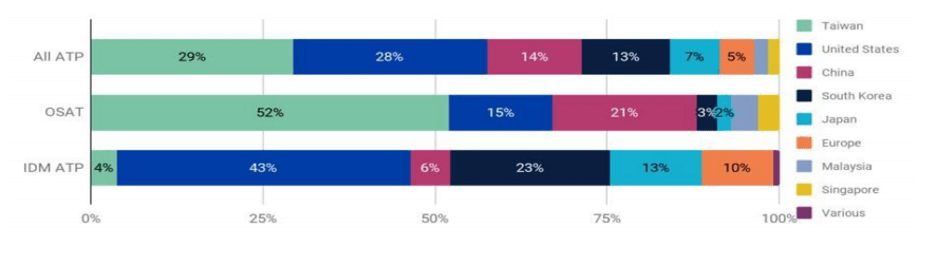 “In the back-end – or assembly test and packaging (ATP) stage, chips are assembled into finished semiconductor components, tested, and packaged for incorporation into finished products. The ATP stage occurs under two models: (1) by IDMs and foundries or (2) by Outsourced Semiconductor Assembly and Test (OSAT) companies that specialize at the test and assembly business and provide services on contract. While U.S. companies have 28 percent of the market share of ATP revenues and 43 percent of the market share of IDM ATP revenues … companies have outsourced ATP production to facilities outside the United States. Foundries such as TSMC (Taiwan), UMC (Taiwan), SMIC (China), and XMC (China) have entered the packaging business to increase the manufacturing services they offer to their fabless customers, especially the advanced packaging of chiplets. TSMC introduced its first advanced packaging solution in 2012. Market shares by region are shown in Figure 1.